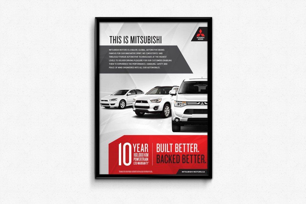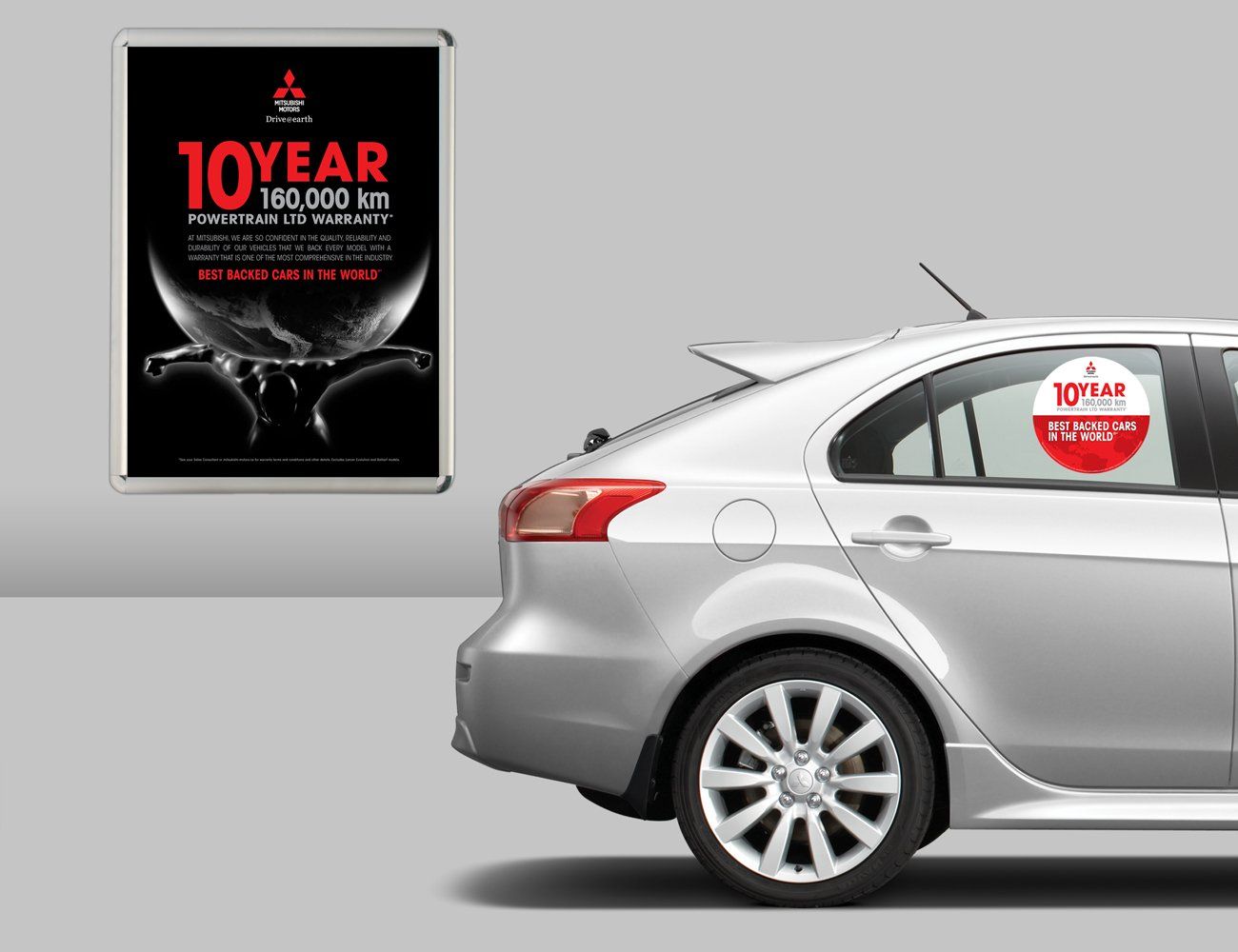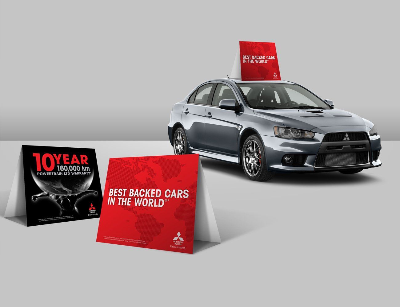 Successfully promoted one of Mitsubishi Motors key offerings through a Retail Marketing POS Campaign. Mitsubishi’s industry leading vehicle warranty needed to engage customers at the most important point of contact in their purchase cycle – Retail. The campaign consisted of several showroom elements; floor stands, vehicle clings, showroom posters, car toppers, brochures and window adhesive posters.